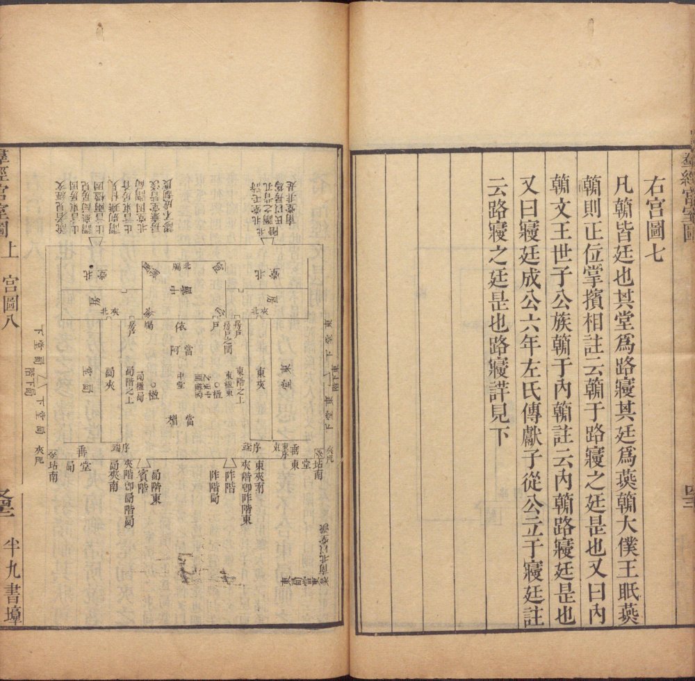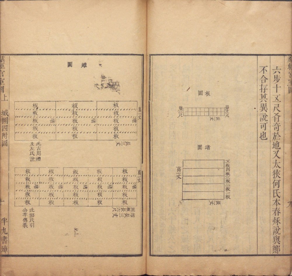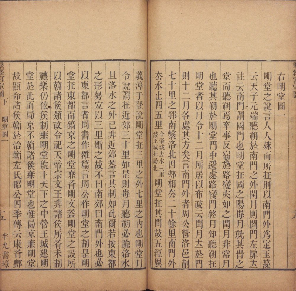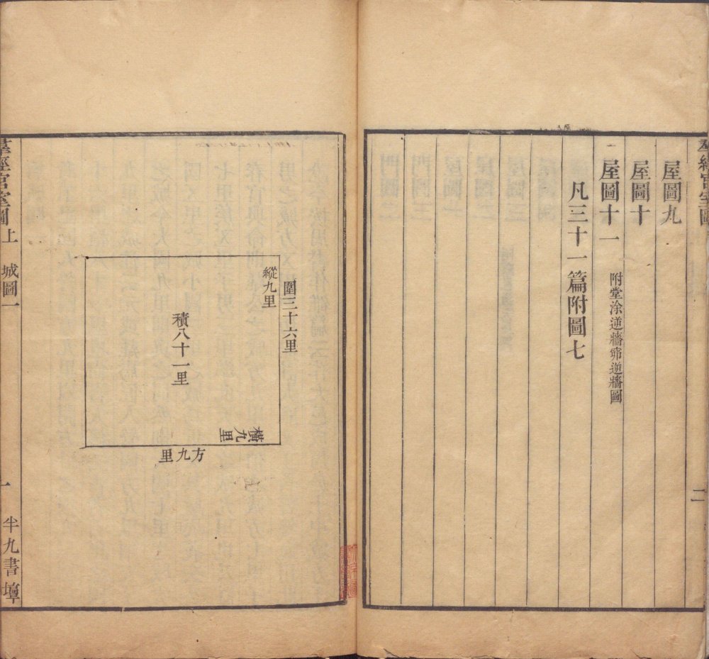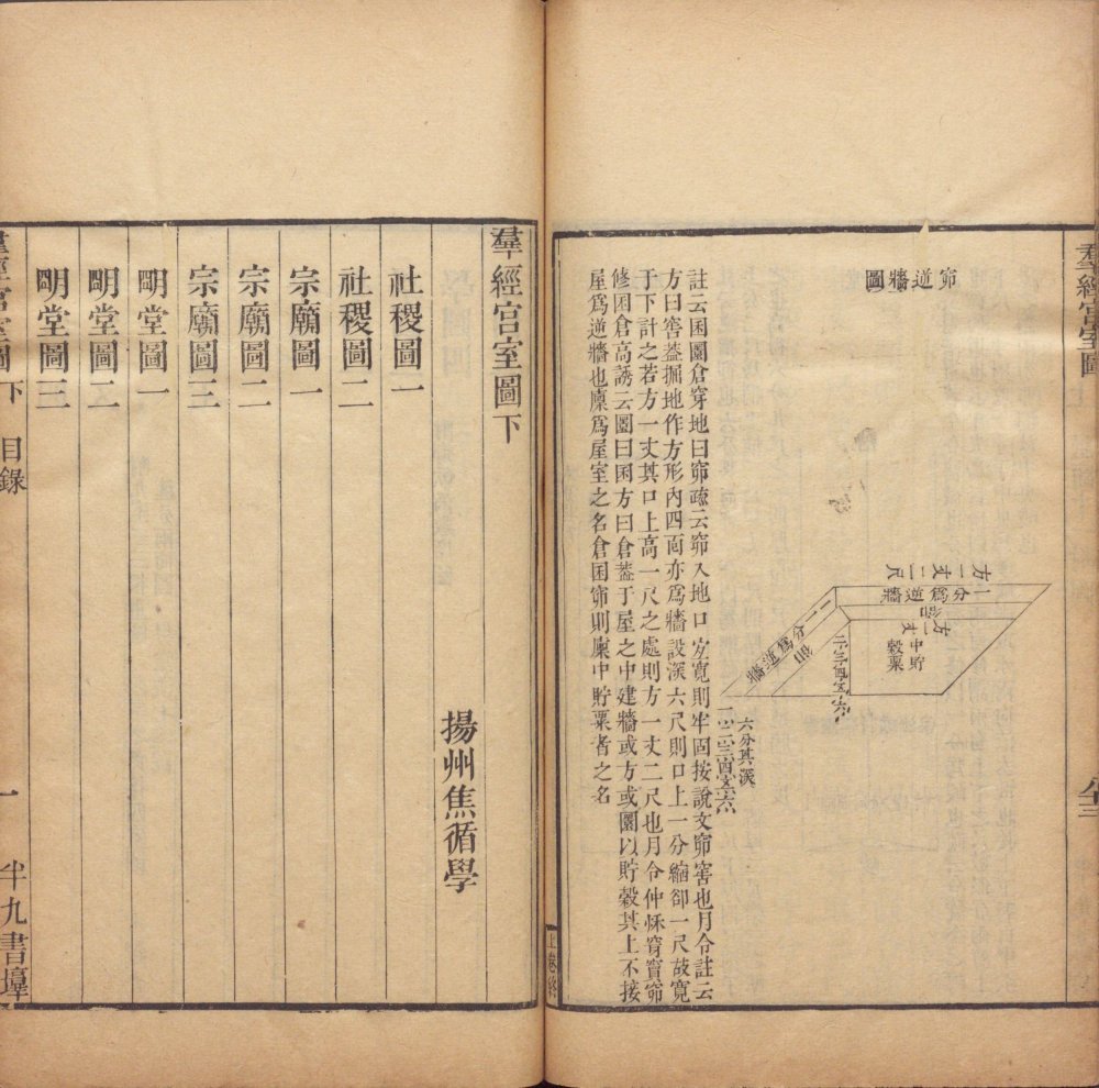 此《群经宫室图》由清代焦循撰。全书分上下两卷,上卷分城、宫、门、屋四类。图三十一篇,附图七种;下卷分社稷、宗庙、明堂、坛、学五类,图十九篇,附图五种。其内容为考订帝王宫室建筑制度,每图均有说一篇。此为清嘉庆五年江都焦氏半九书塾刊本。