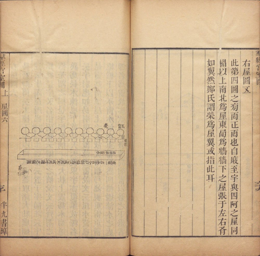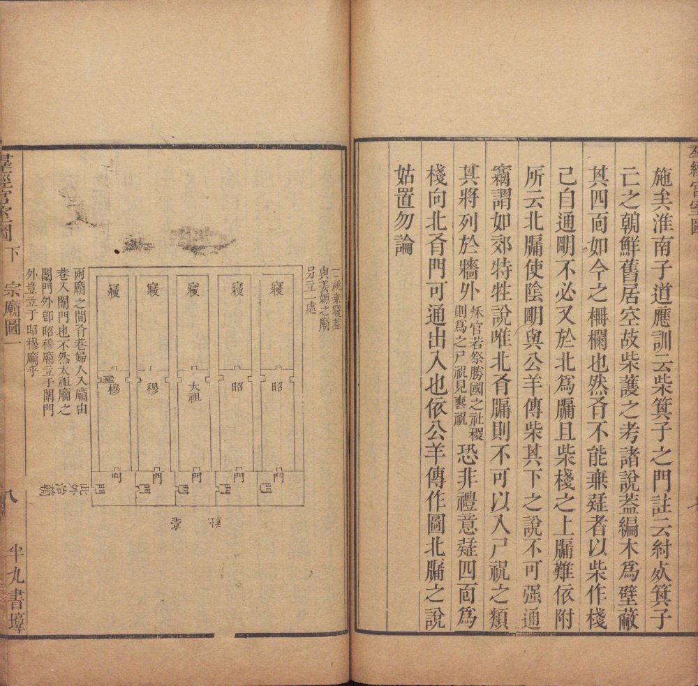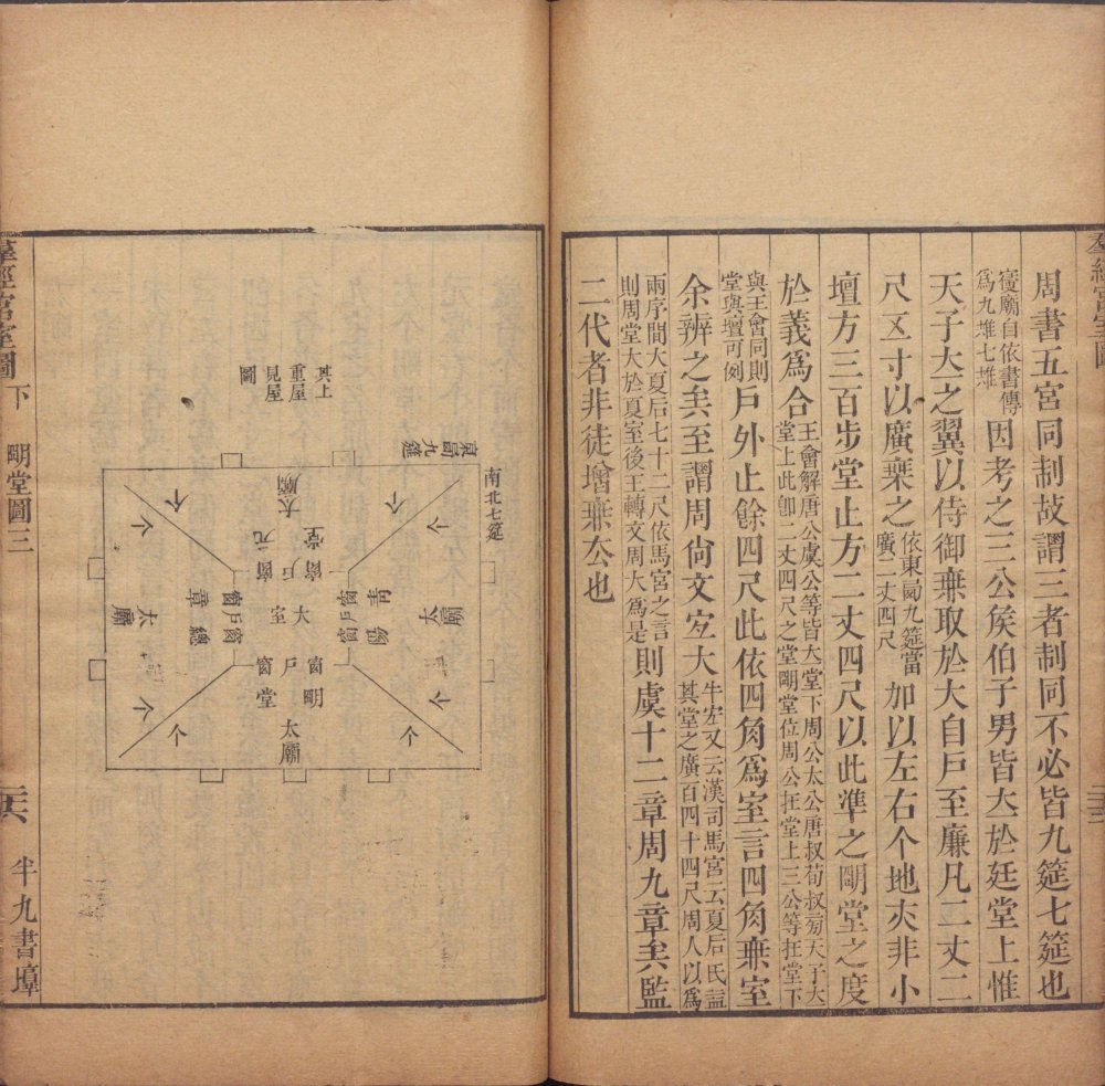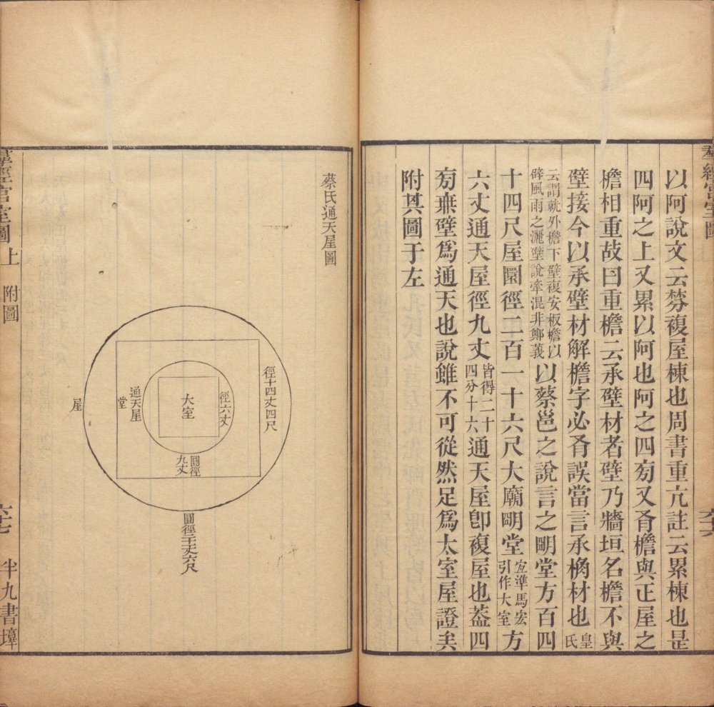 此《群经宫室图》由清代焦循撰。全书分上下两卷,上卷分城、宫、门、屋四类。图三十一篇,附图七种;下卷分社稷、宗庙、明堂、坛、学五类,图十九篇,附图五种。其内容为考订帝王宫室建筑制度,每图均有说一篇。此为清嘉庆五年江都焦氏半九书塾刊本。