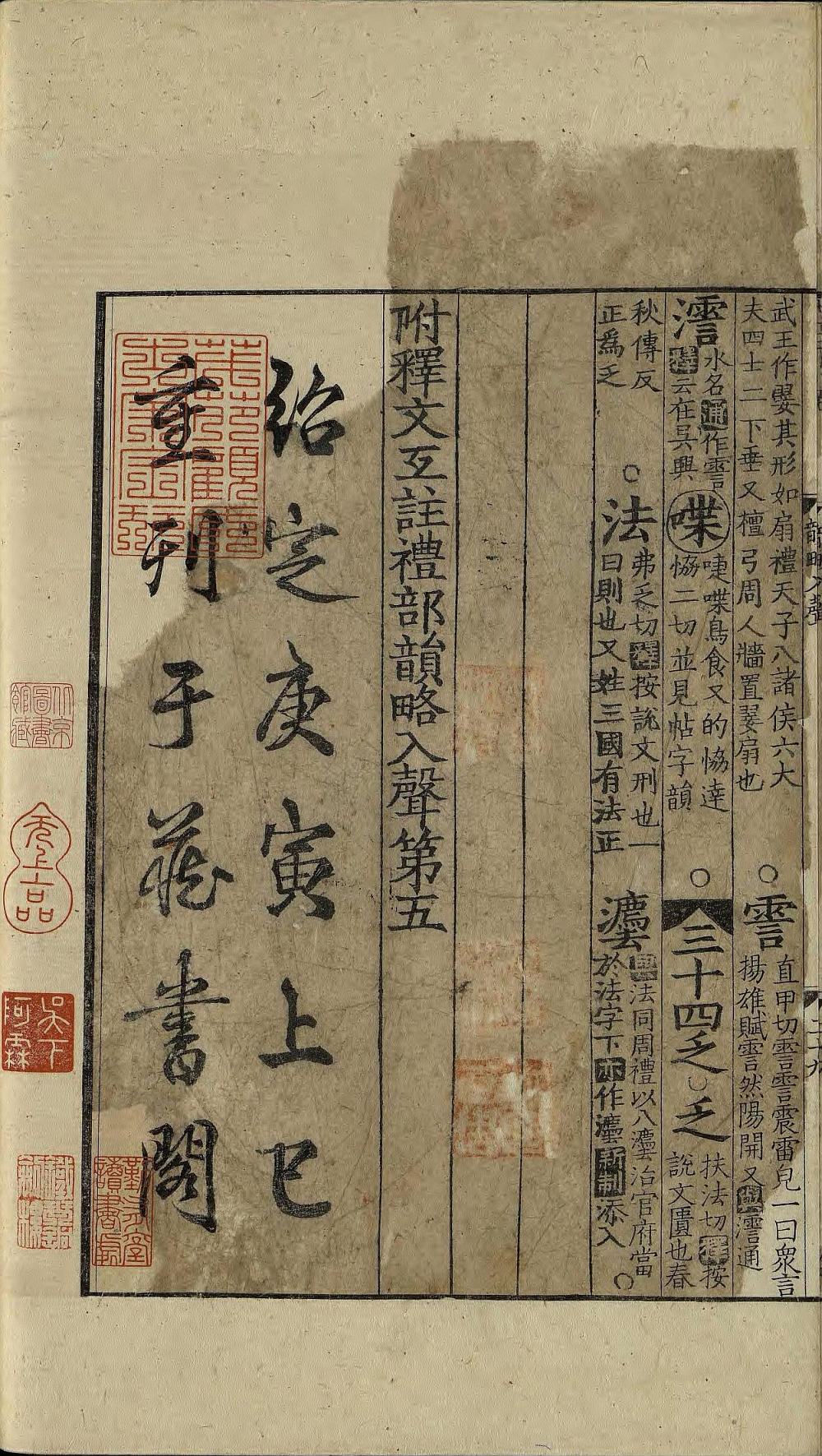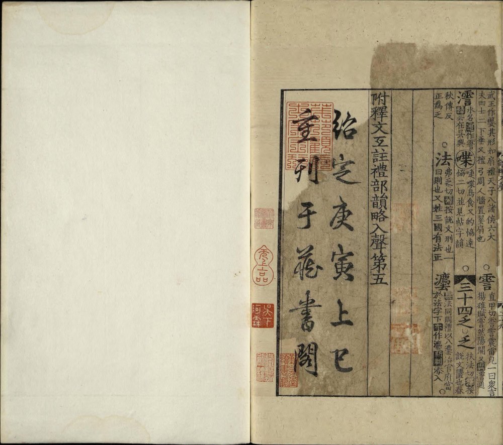 此《附释文互注礼部韵略》是宋代官修韵书《礼部韵略》的注释本。全书分作:上平声、下平声、上声、去声、入声五卷。收录约 9564 字,每字下先列官注,后附互注及新增释文,中间用 “释” 隔开,以示区别。前附《韵略条式》记录官方牒文和程文规范与避讳。此为宋绍定三年藏书阁刊本。