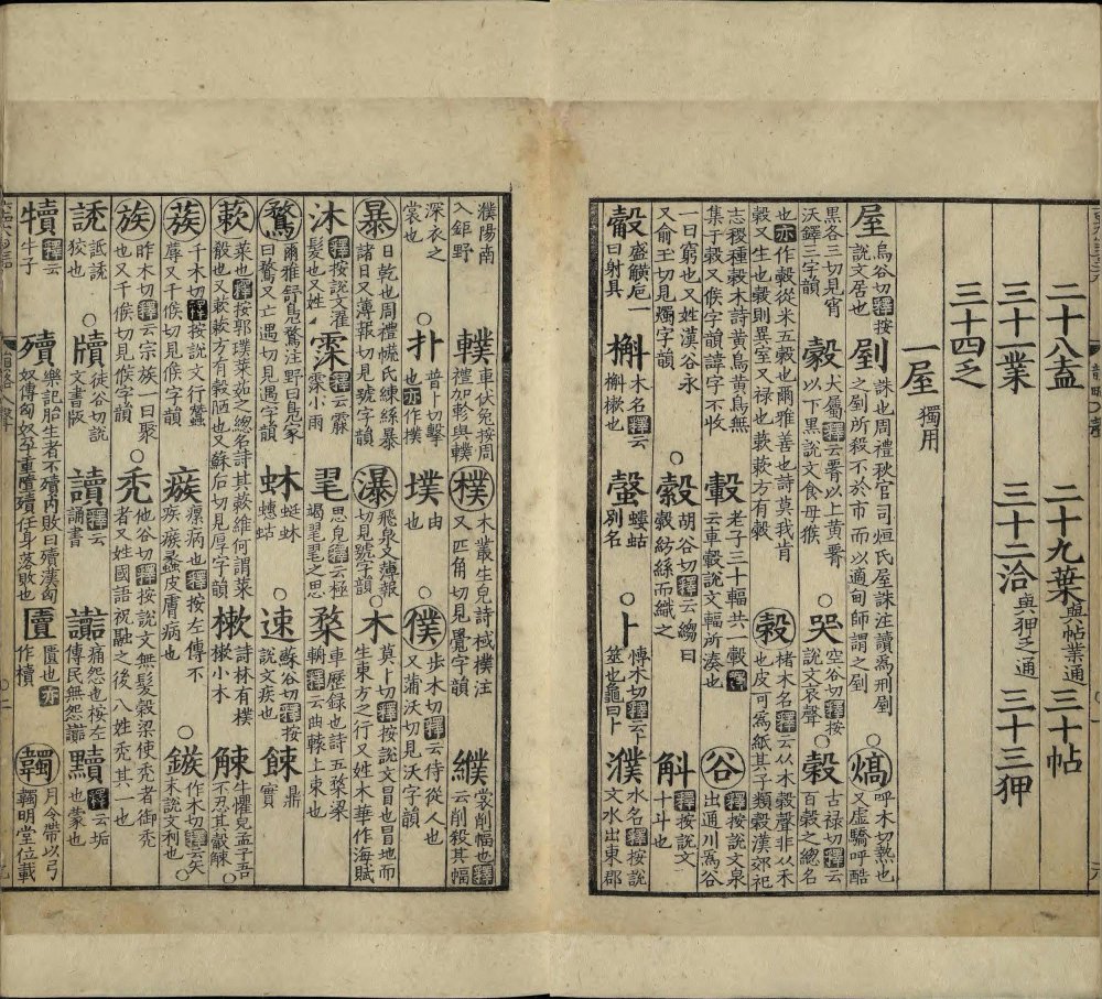 附釋文互注禮部韻略入聲第五:一屋(獨用)、二沃(與燭通)、三燭、四覺(獨用)、五質(與術櫛通)、六術、七櫛、八勿(與迄通)、九迄、十月(與没通)、十一没、十二曷(與末通)、十三末、十四黠(與轄通)、十五轄、十六屑(與薛通)、十七薛、十八藥(與鐸通)、十九鐸、二十陌(與麥昔通)、二十一麥、二十二昔、二十三錫(獨用)、二十四職(與德通)、二十五德、二十六緝(獨用)、二十七合(與盍通)、二十八盍、二十九葉(與帖業通)、三十帖、三十一業、三十二洽(與狎乏通)、三十三狎、三十四乏