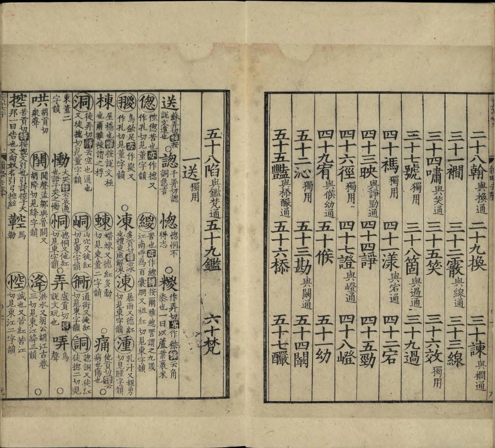 附釋文互注禮部韻略去聲第四:一送(獨用)、二宋(與用通)、三用、四絳(獨用)、五寘(與至志通)、六至、七志、八未(獨用)、九御(獨用)、十遇(與暮通)、十一暮、十二霽(與祭通)、十三祭、十四泰(獨用)、十五卦(與怪夬通)、十六怪、十七夬、十八隊(與代廢通)、十九代、二十廢、二十一震(與稕同)、二十二稕、二十三問(與焮通)、二十四焮、二十五願(與慁恨通)、二十六慁、二十七恨、二十八翰(與換通)、二十九換、三十諫(與襇通)、三十一襇、三十二霰(與線通)、三十三線、三十四嘯(與笑通)、三十五笑、三十六效(獨用)、三十七號(獨用)、三十八箇(與過通)、三十九過、四十禡(獨用)、四十一漾(與宕通)、四十二宕、四十三映(與諍勁通)、四十四諍、四十五勁、四十六徑(獨用)、四十七證(與嶝通)、四十八嶝、四十九宥(與候幼通)、五十候、五十一幼、五十二沁(獨用)、五十三勘(與闞通)、五十四闞、五十五豔(與㮇釅通)、五十六㮇、五十七釅、五十八陷(與鑑梵通)、五十九鑑、六十梵