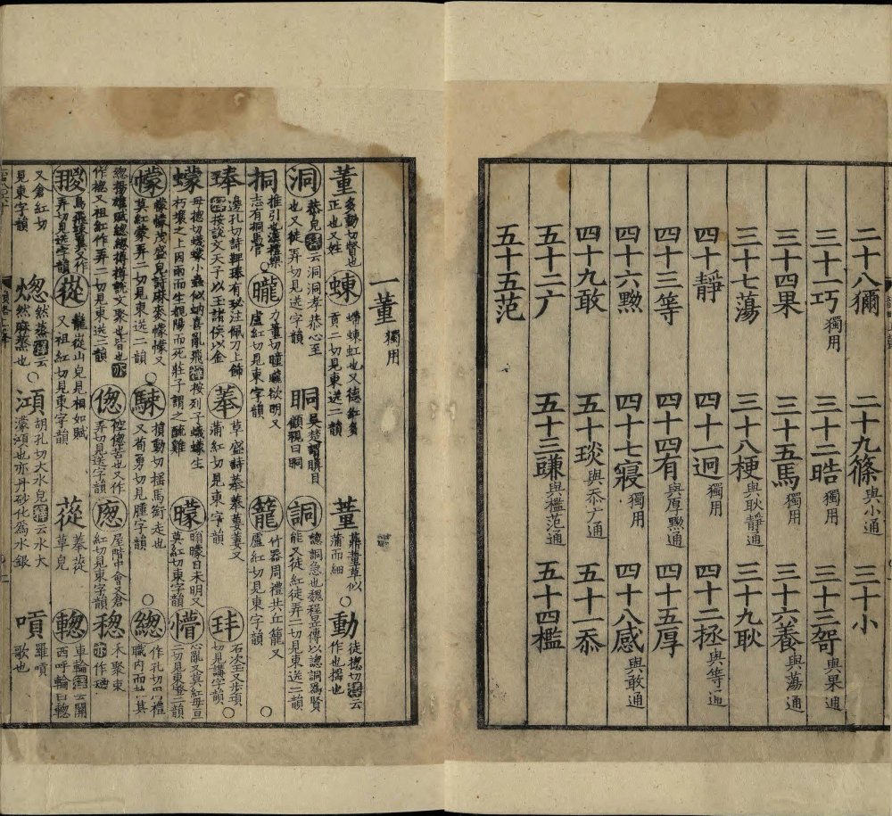 附釋文互注禮部韻略上聲第三:一董(獨用)、二腫(獨用)、三講(獨用)、四紙(與旨止通)、五旨、六止、七尾(獨用)、八語(獨用)、九麌(與姥通)、十姥、十一薺(獨用)、十二蟹(與駭通)、十三駭、十四賄(與海通)、十五海、十六軫(與準通)、十七準、十八吻(與隱通)、十九隱、二十阮(與混很通)、二十一混、二十二很、二十三旱(與緩通)、二十四緩、二十五潸(與産通)、二十六産、二十七銑(與獮通)、二十八獮、二十九篠(與小通)、三十小、三十一巧(獨用)、三十二晧(獨用)、三十三哿(與果通)、三十四果、三十五馬(獨用)、三十六養(與蕩通)、三十七蕩、三十八梗(與耿靜通)、三十九耿、四十靜、四十一迥(獨用)、四十二拯(與等通)、四十三等、四十四有(與厚黝通)、四十五厚、四十六黝、四十七寢(獨用)、四十八感(與敢通)、四十九敢、五十琰(與忝广通)、五十一忝、五十二广、五十三豏(與檻范通)、五十四檻、五十五范