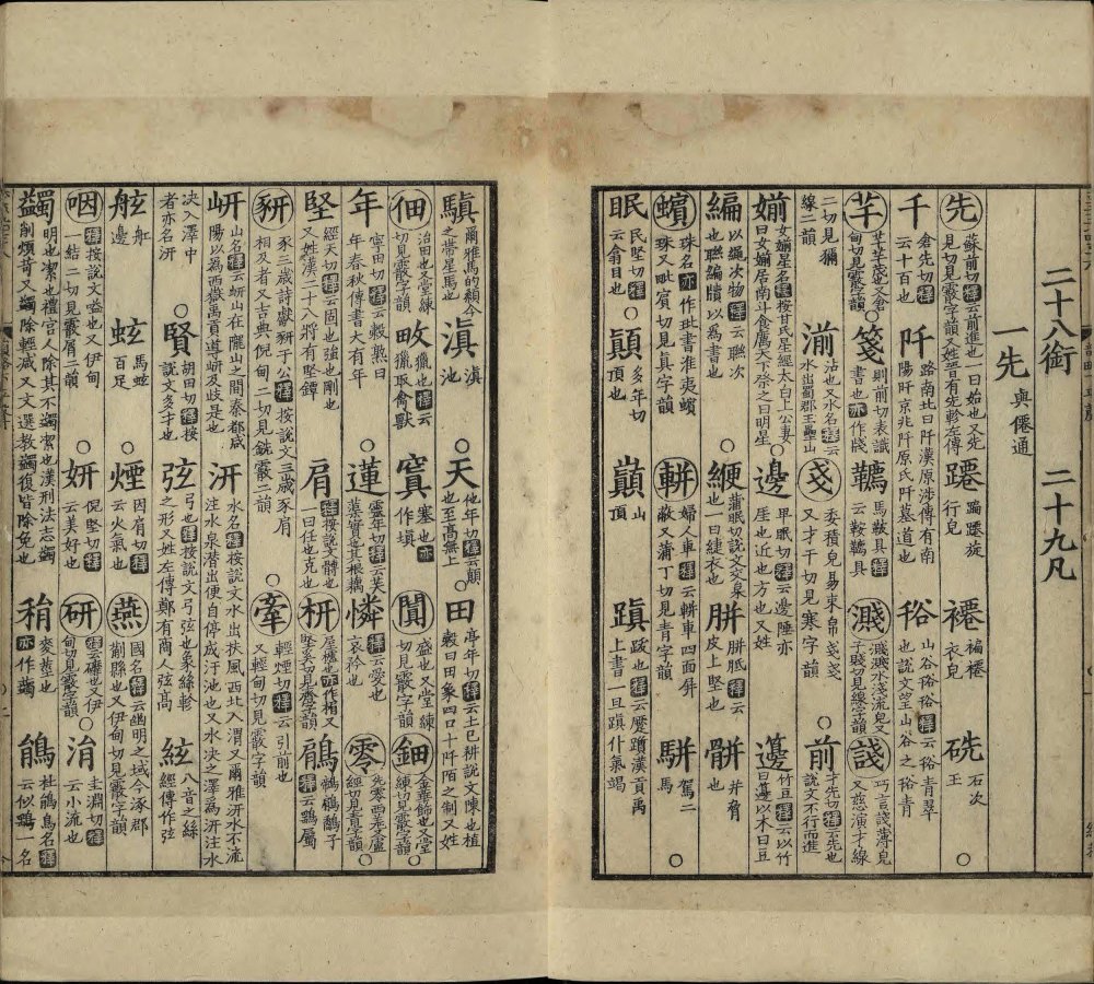 附釋文互注禮部韻略下平聲第二:一先(與僊通)、二僊、三蕭(與宵通)、四宵、五爻(獨用)、六豪(獨用)、七歌(與戈通)、八戈、九麻(獨用)、十陽(與唐通)、十一唐、十二庚(與耕清通)、十三耕、十四淸、十五靑(獨用)、十六蒸(與登通)、十七登、十八尤(與侯幽通)、十九侯、二十幽、二十一侵(獨用)、二十二覃(與談通)、二十三談、二十四鹽(與添嚴通)、二十五添、二十六嚴、二十七咸(與銜凡通)、二十八銜、二十九凡