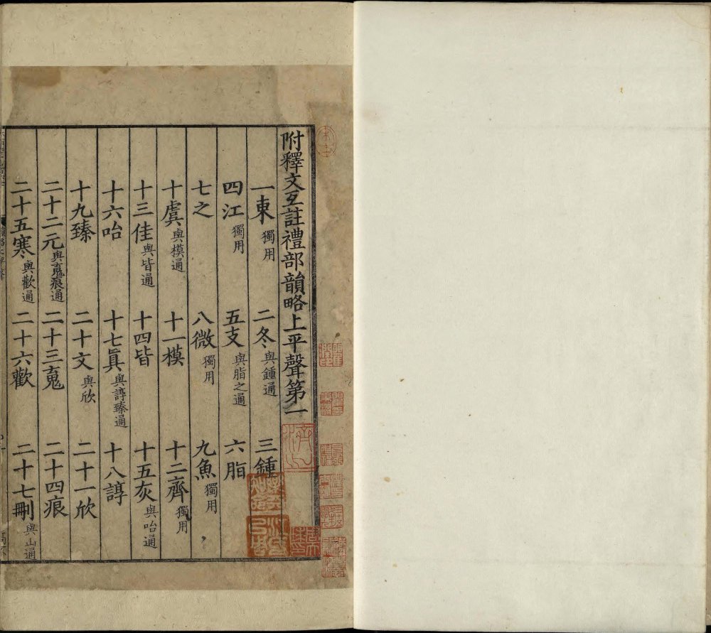 附釋文互注禮部韻略上平聲第一:一東(獨用)、二冬(與鍾通)、三鍾、四江(獨用)、五支(與脂之通)、六脂、七之、八微(獨用)、九魚(獨用)、十虞(與模通)、十一模、十二齊(獨用)、十三佳(與皆通)、十四皆、十五灰(與咍通)、十六咍、十七眞(與諄臻通)、十八諄、十九臻、二十文(與欣通)、二十一欣、二十二元(與䰟痕通)、二十三䰟、二十四痕、二十五寒(與歡通)、二十六歡、二十七刪(與山通)、二十八山
